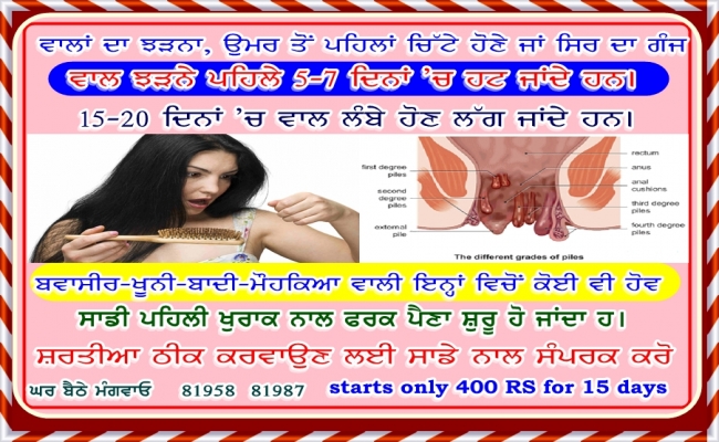 ਅਜਕਲ ਦੇ ਸਮੇ ਵਿੱਚ ਦਿਮਾਗੀ ਸਿਰਦਰਦੀ ਜ਼ਿਆਦਾ ਹੋਣ ਦੇ ਕਾਰਨ , ਮਹਿੰਗਾਈ ਜ਼ਿਆਦਾ ਹੋਣ ਦੇ ਕਾਰਨ , ਕਬੀਲਦਾਰੀ ਵੱਡੀ ਹੋਣ ਦੇ ਕਾਰਨ ਆਸਪਾਸ ਦੀ ਛੋਟੀ ਤੋ ਲੈ ਕੇ ਵੱਡੀ ਪਰੇਸ਼ਾਨੀ ਹੋਣ ਦੇ ਕਾਰਨ , ਖਾਣ-ਪੀਣ ਦੇ ਠੀਕ ਢੰਗ ਨਹੀਂ ਹੋਣ ਦੇ ਕਾਰਨ , ਗਲਤ ਆਦਤਾਂ ਦੇ ਆਦੀ ਹੋਣ ਦੇ ਕਾਰਨ 100 ਵਿੱਚੋਂ 80 ਲੋਕਾਂ ਦੇ ਨਾਲ ਇਹ ਰੋਗ ਆਪਣਾ ਸੰਬੰਧ ਬਨਾ ਚੁਕਾ ਹੈ | ਜੇਕਰ ਤੁਸੀ ਉਕਤ ਰੋਗ ਦਾ ਇਲਾਜ ਸਾਡੇ ਕੋਲ ਤੋ ਕਰਵਾਓਗੇ ਤਾਂ ਬਾਲਾਂ ਦੀ ਸਮੱਸਿਆ ਤਾਂ ਤੁਹਾਡੀ ਹੱਲ ਹੋਵੋਗੇ ਹੀ , ਨਾਲ ਹੀ ਤੁਹਾਡੀ ਦਿਮਾਗੀ ਪਰੇਸ਼ਾਨੀਯਾਂ ਅਤੇ ਇਸ ਪਰੇਸ਼ਾਨੀਆਂ ਕਰਕੇ ਪੈਦਾ ਹੋਈ ਘਰ ਵਿੱਚ ਲੜਾਈ ਅਤੇ ਮਾਨਸਿਕ ਉਦਾਸੀ ਵੀ ਦੂਰ ਹੋ ਜਾਵੇਗੀ | ਸਾਡੀ ਦਵਾਈ ਤੁਹਾਡੀ ਰੋਗ ਦਾ ਉੱਤੇ ਉੱਤੇ ਤੋ ਇਲਾਜ ਨਹੀ ਕਰਦੀ ਬਲਕਿ ਅੰਦਰੂਨੀ ਤੌਰ ਉੱਤੇ ਜੜ ਤੋ ਕਰਦੀ ਹੈ | ਜਿਸ ਕਾਰਨ ਤੁਹਾਡਾ ਸ਼ਰੀਰ ਬਿਲਕੁਲ ਨਿਰੋਗ ਹੋ ਜਾਂਦਾ ਹੈ | ਬਾਲਾਂ ਦਾ ਝੜਨਾ ਜਾਂ ਉਮਰ ਤੋ ਪਹਿਲਾਂ ਸਫੇਦ ਹੋਣਾ ਜਾਂ ਸਿਰ ਦਾ ਗੰਜਾ ਹੋਣਾ , ਦਾੜੀ ਨਹੀਂ ਆਉਣ ਦਾ ਘਰ ਬੈਠੇ ਇਲਾਜ ਕਰਵਾਉਣ ਲਈ – ਕਲਿਕ ਕਰੋ |
